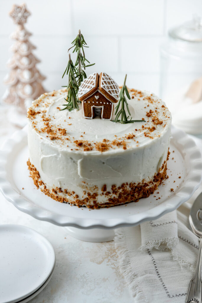 3. Frost the top and sides of the cake with the remaining cream cheese frosting. Decorate with your choice of crushed gingersnap cookies around the top and bottom edges, fresh rosemary sprigs, or gingerbread cookies for a festive touch!