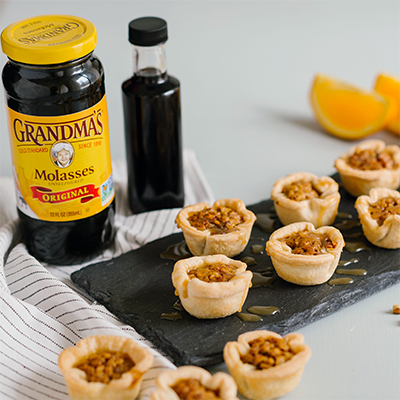 4. In a large bowl, combine pecans, sugar, molasses, orange juice, eggs, melted butter, vanilla and salt. Once mixed, gradually add flour until blended.